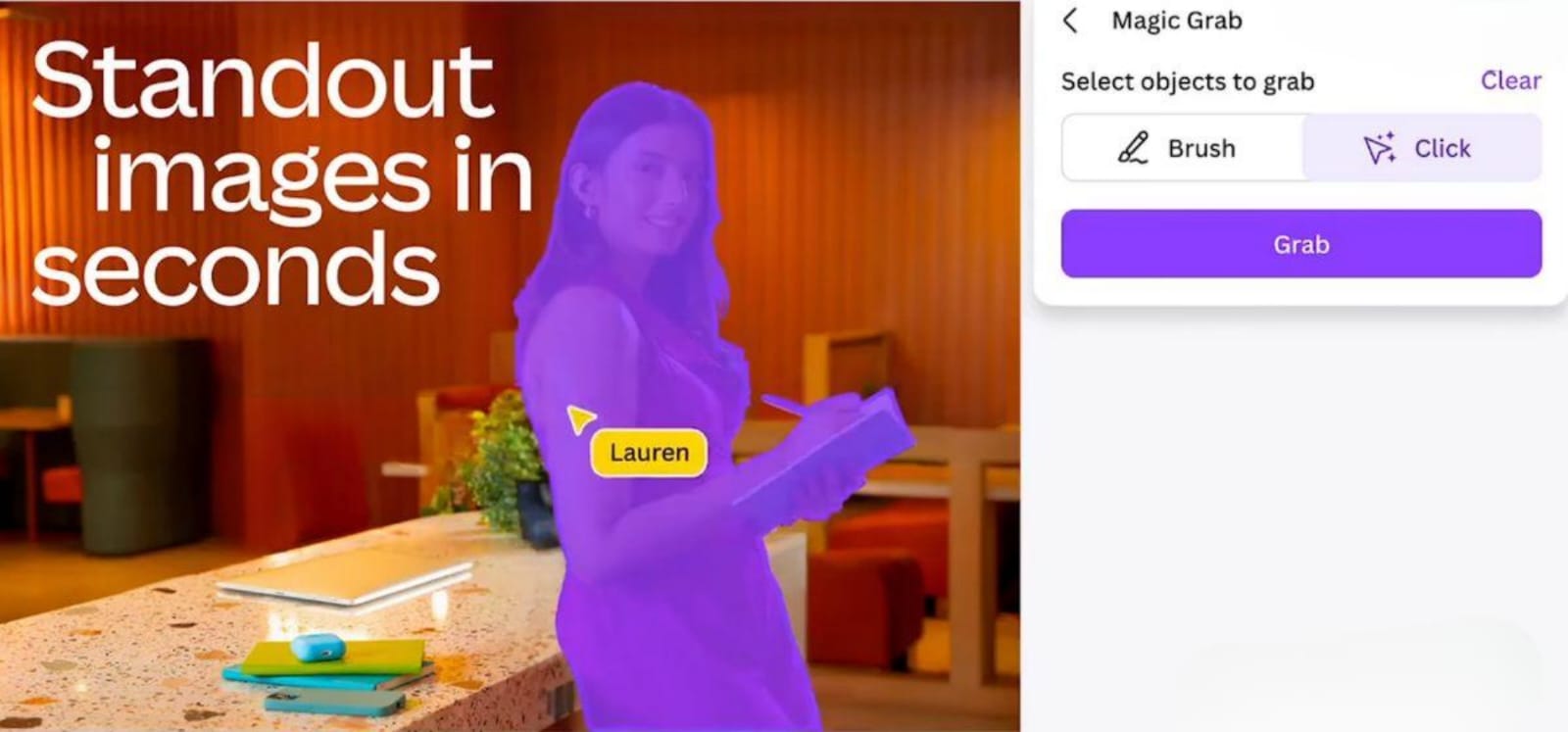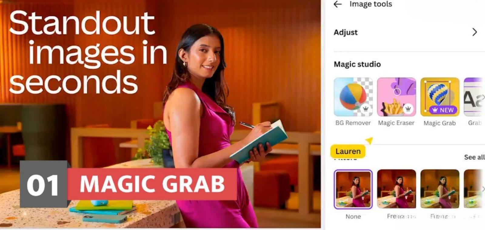 Let’s start with one of Canva’s coolest tools—Magic Grab. If you’ve ever struggled with selecting and moving specific elements in a photo without ruining the background, this feature is about to become your new best friend. Magic Grab lets you easily select, move, or resize any part of an image with precision, all while keeping the rest of your design intact. It’s like having a magic wand for photo editing!